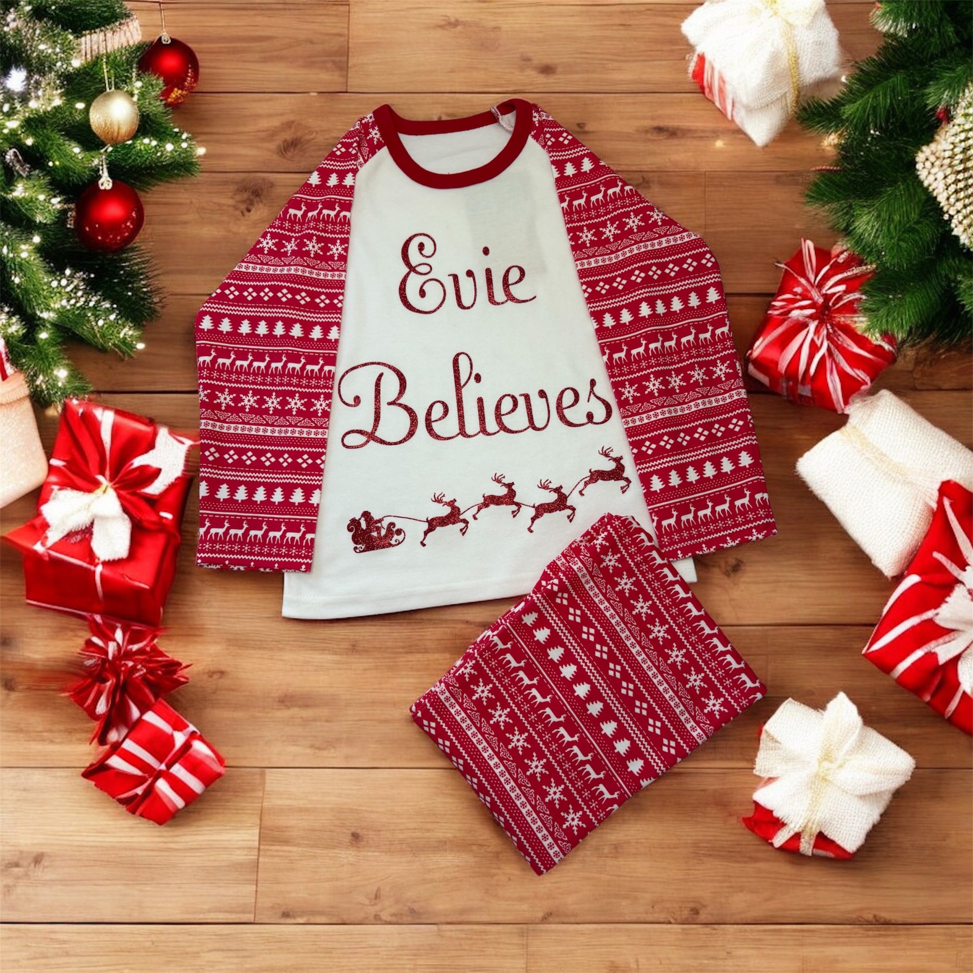 Stunning red christmas pattern pyjamas that are available to purchase for the whole family. They are super soft and beautifully vibrant.
